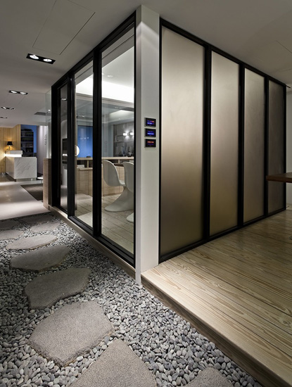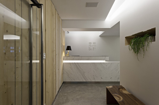 剛剛踏入春雨的玄關,顯現在我們眼前的就是一種休閑的自然感,給人一種徹底打破既往辦公室的印象。水泥磨光地面、銀狐白大理石柜面,佐以不銹鋼收邊,一盞特色桌燈,一種現代流暢感的流露成為入場注目的焦點。