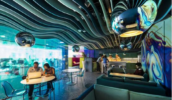 上圖是愛爾蘭谷歌休息區(qū)內(nèi)景,現(xiàn)代感的水流式設(shè)計(jì)為主基調(diào)、藍(lán)色海洋的主要色調(diào),擺脫了板式辦公家具的枯燥乏味,配合以簡(jiǎn)易卻頗有設(shè)計(jì)感的圓桌、吧臺(tái)、沙發(fā)。整體舒緩的設(shè)計(jì)理念呼之欲出,如此休息環(huán)境,員工迸發(fā)出更加優(yōu)質(zhì)的創(chuàng)意靈感輕而易舉,這就是谷歌!