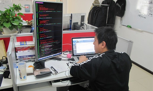 此圖是美團網技術部某員工的工位,美團目前技術部員工高達幾十人,每個人的電腦都很有范兒。