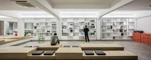 演講——兩種模數(shù)的白色木架由書架變?yōu)檠葜v所需的坐凳,而高15公分和30公分兩種規(guī)格橡木盒堆疊成為高45公分之講臺(tái),滿足50-100人左右的小型演講報(bào)告會(huì),也是所謂的設(shè)計(jì)師們切磋的平臺(tái),也是設(shè)計(jì)師自我陶醉,滿足虛榮心的試驗(yàn)場(chǎng)。