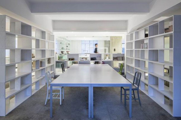 圖書館——所有的書架疊起,空間中變身成為一個(gè)小型圖書館,當(dāng)然這種功能在現(xiàn)在只有306平米的空間中還很奢侈,但是設(shè)計(jì)師可以創(chuàng)造空間,設(shè)計(jì)師置身于自己絞盡腦汁創(chuàng)造出稱之為圖書館的空間中,或許是過一把沒有機(jī)會(huì)做一個(gè)圖書館的設(shè)計(jì)之癮,而也或許是設(shè)計(jì)師在滿足自己虛榮心的又一個(gè)意淫行為而已。