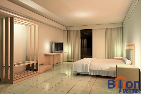 不同的酒店家具,表面用料是有區(qū)別的。如桌、椅、柜的腿子,要求用硬雜木,比較結(jié)實(shí),能承重,而內(nèi)部用料則可用其他材料;大衣柜腿的厚度要求達(dá)到62.5px,太厚就顯得笨拙,薄了容易彎曲變形;廚房、衛(wèi)生間的柜子不能用纖維板做,而應(yīng)該用三合板,因?yàn)榫S板遇水會膨脹、損壞;餐桌則應(yīng)耐水洗。
