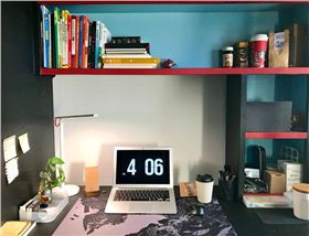 這是位在碧江辦公家具定制員工宿舍桌的客戶,深色系的桌面搭配紅色的隔板,非常經典的紅黑搭配,久看不厭。隔層上有序的擺放書籍和一些飲料零食,臺面上用歸納盒把一些零散的文具放在一起,顯得臺面整齊干凈,主人應該是個很干凈知書達理的小哥哥了。