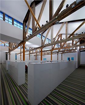 走過前臺(tái)接待大廳,迎面而來的即是職員辦公區(qū)大廳。這里采用的亦是BOLON地膠板,只不過這里用的是純白色和綠灰相間的,這種相間方式目的就是為了和百年的木構(gòu)架能有一個(gè)完美的相互襯托的效果。讓照明燈與空調(diào)暖氣設(shè)備隱藏于白色柜體和木構(gòu)架之后,不破壞強(qiáng)烈的色彩沖擊,創(chuàng)造出一個(gè)傳統(tǒng)的超現(xiàn)代辦公空間。