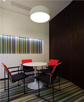 這里的前臺(tái)接待大廳,一上來就仿佛給我們帶來神來一筆一樣,大膽的采用了色彩鮮艷的BOLON地膠板來作為前臺(tái)接待廳的主基調(diào)。與此同時(shí),在前臺(tái)接待廳墻壁上的留白剛好與彩色地板形成了一個(gè)強(qiáng)烈的對(duì)比,碰撞出空間獨(dú)特味道的同時(shí),帶給人一種愜意的簡(jiǎn)約創(chuàng)意辦公空間。